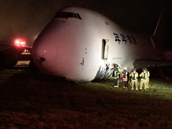 波音747-412货机降落不慎横冲国际机场跑道外围